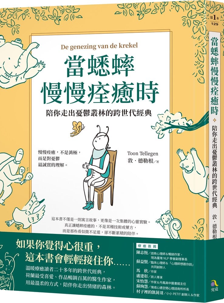 《當蟋蟀慢慢痊癒時》,這本書談的是一隻不知為何陷入憂鬱的蟋蟀,從低潮中慢慢復原的過程。但就在牠慢慢痊癒的時候,讀者千萬別忘了,故事裡還有一個平行的故事:一頭努力想爬上樹的樂觀大象。