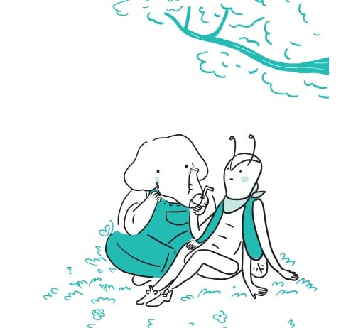 蟋蟀並沒有忽然振作,大象也沒有真的爬上樹。但事情卻有了改變:他們都停止和自己對抗,而且都得到了同伴的陪伴。