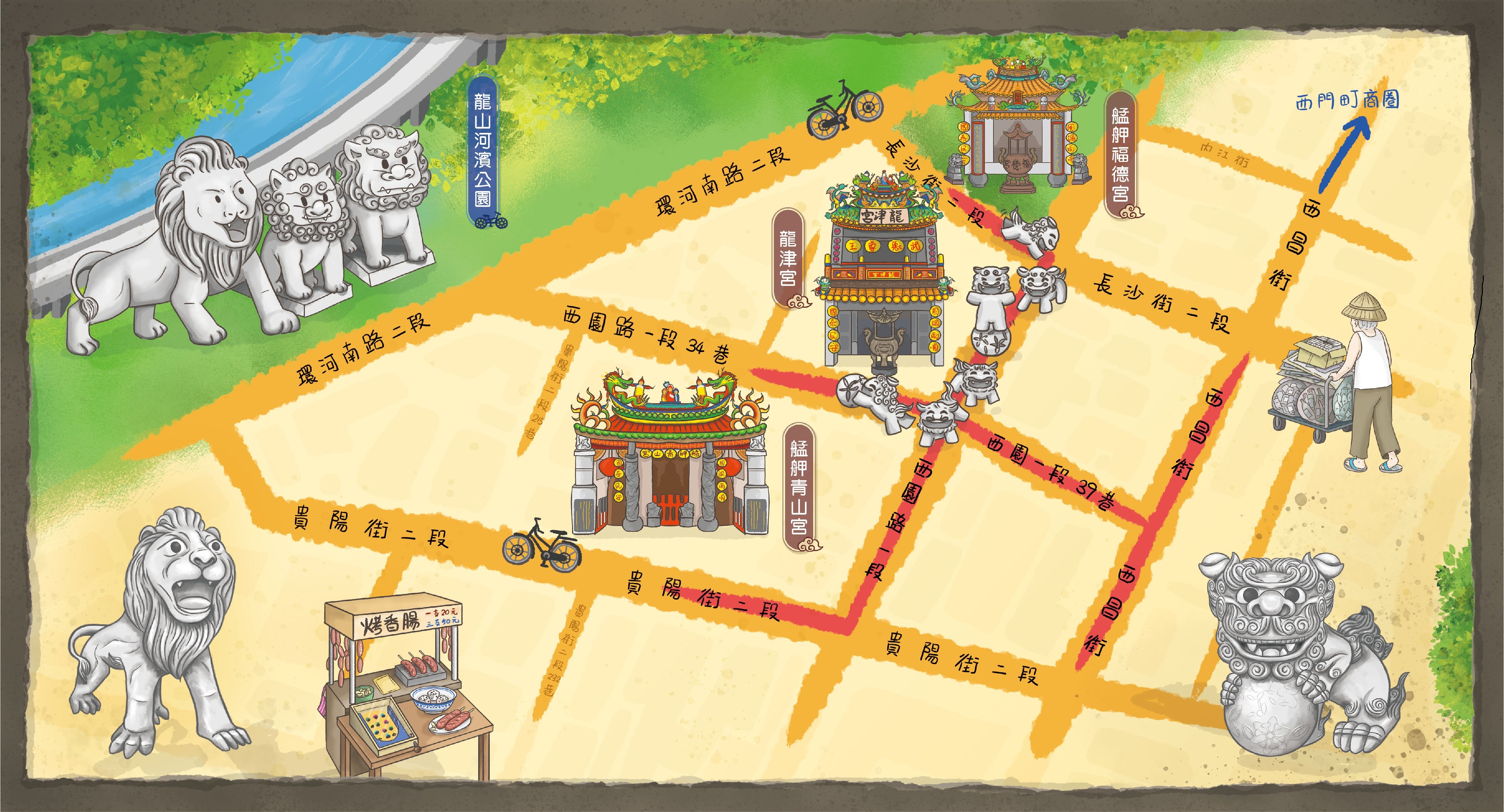 *沉浸式閱讀《艋舺奇幻調》,書中附有〈騎著石獅上街去〉全彩拉頁地圖兩頁