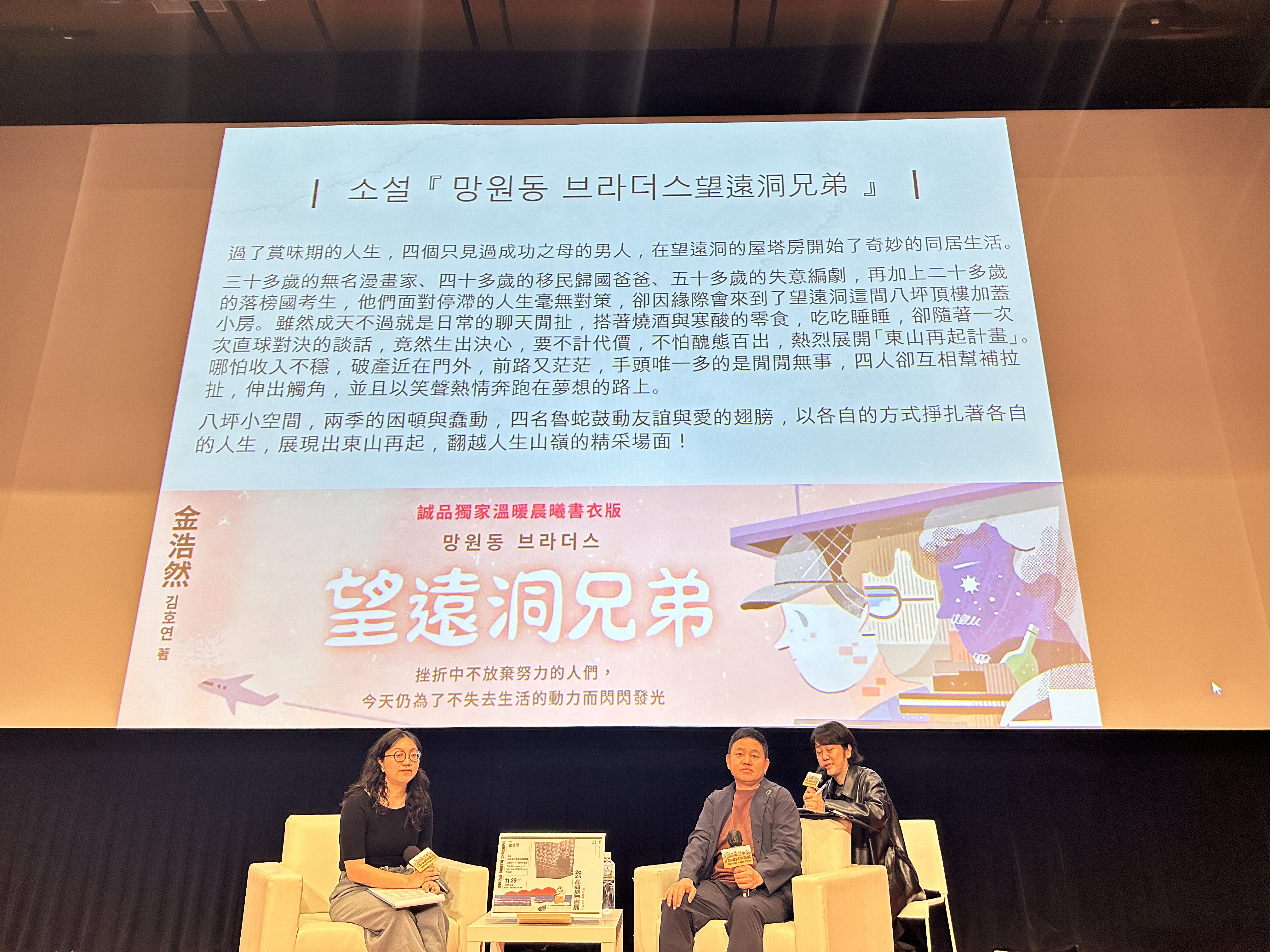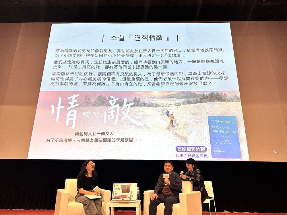 金作家來到舞台中央沙發坐下,藉由主持人精心問答引導,娓娓敘述起「小說寫作的喜悅與悲傷」,而在他身後的螢幕,也是作品在各國版本的封面驚喜輪播。