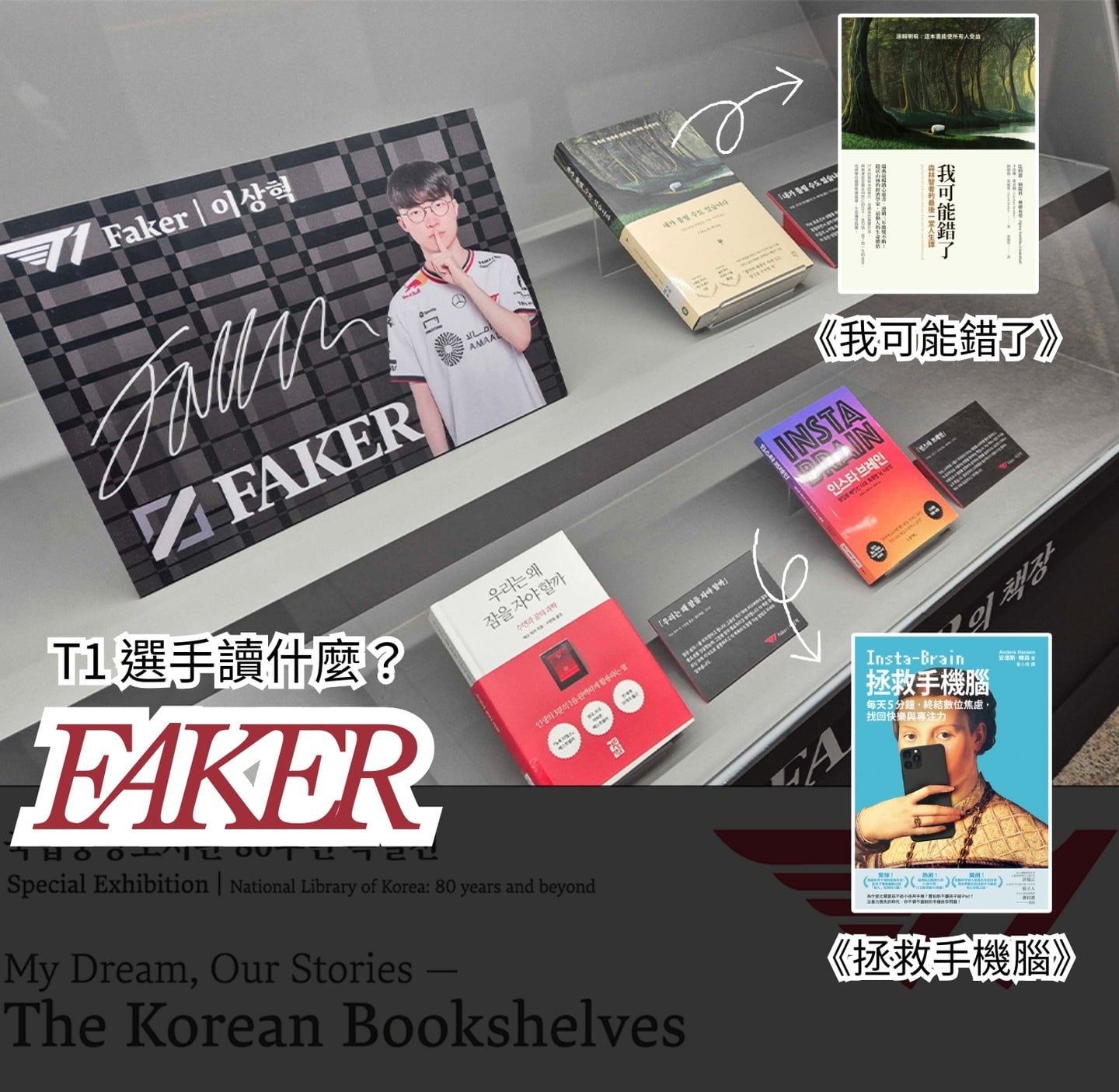 韓國政府同時共襄盛舉。2025國立中央圖書館慶祝開館80週年時,舉辦特展「我的夢、我們的紀錄──韓國人的書架」,就邀請到電競隊伍 T1 的五位選手推薦書籍,包括了: