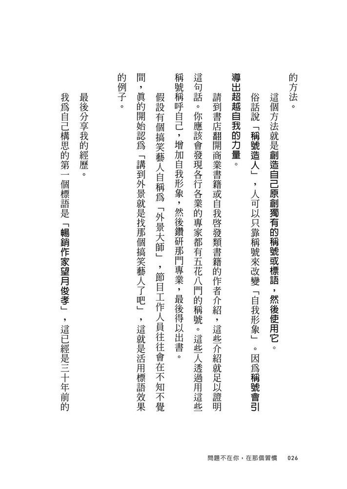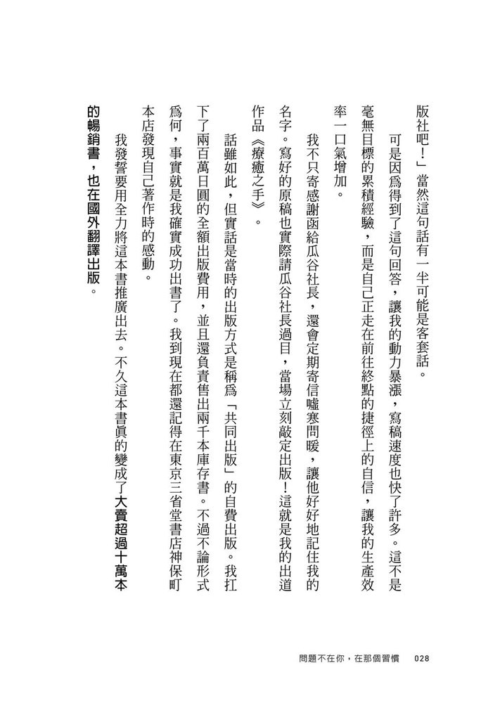 他堅信:「改變習慣,人生就會出現戲劇性變化。」因此他努力專研,透過心理學、名人案例以及實踐經驗,將人生七大領域──「選擇、行動、學習、金錢、健康、人際關係、心理」中的「壞習慣」,有效轉換成「改變未來」的第一步。