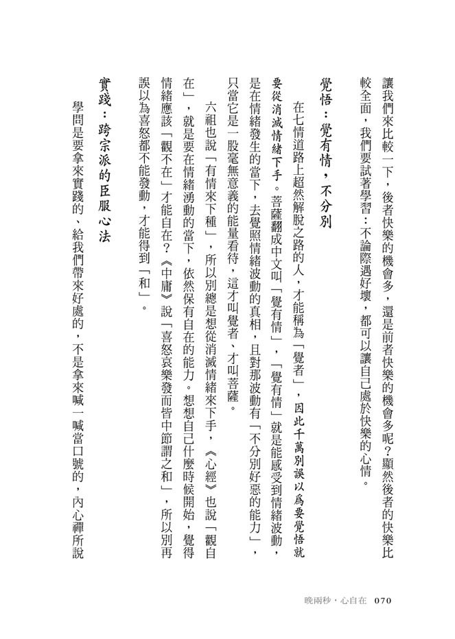 2. 面對情緒最直接、最長效的一個法門:內心禪不走消弭、平撫、轉移、想像、導引、激勵等時時勤拂拭或人為造作的路線,只是去「感內心本來具足的那份純淨」,便能立即獲得安寧,讓情緒長期處在平穩的大自在狀態中,正好補足西方心理學與各宗派修心方法的不足。