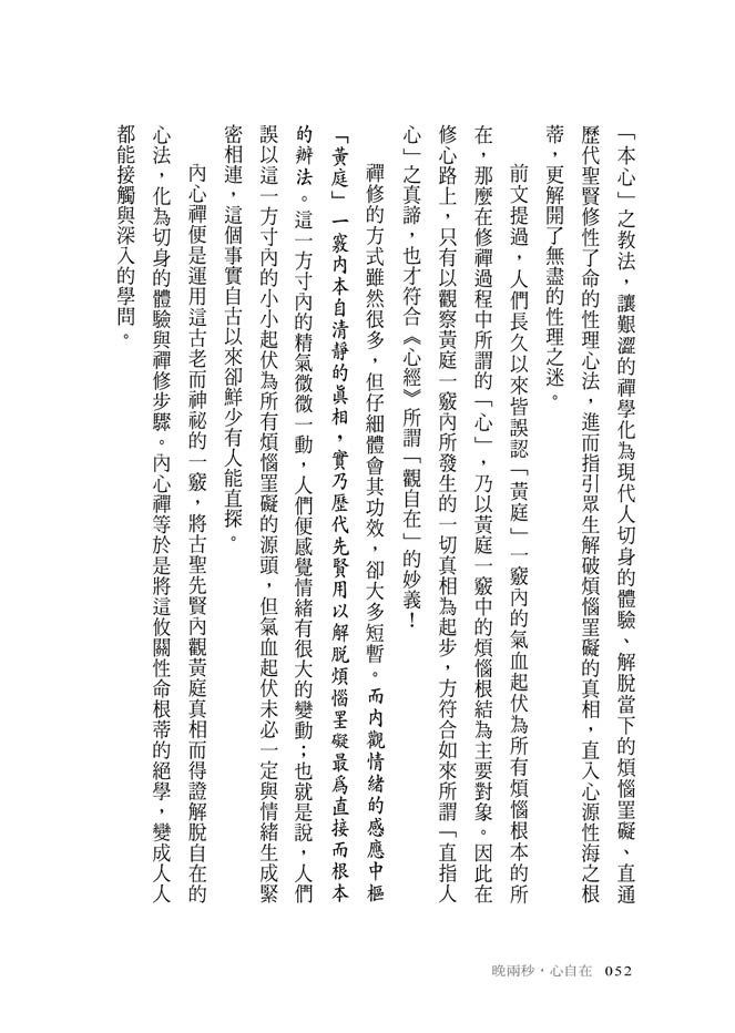 「內心禪」貫通古老神祕的「黃庭一竅」*,將古聖先賢內觀黃庭、得證解脫自在的心法,化為具體可行的禪修四步驟,不僅能解脫當下的煩惱罣礙,更直通歷代聖賢修性了命的性理心法,為現代人開發了一種面對情緒最為簡易而長效的方法。