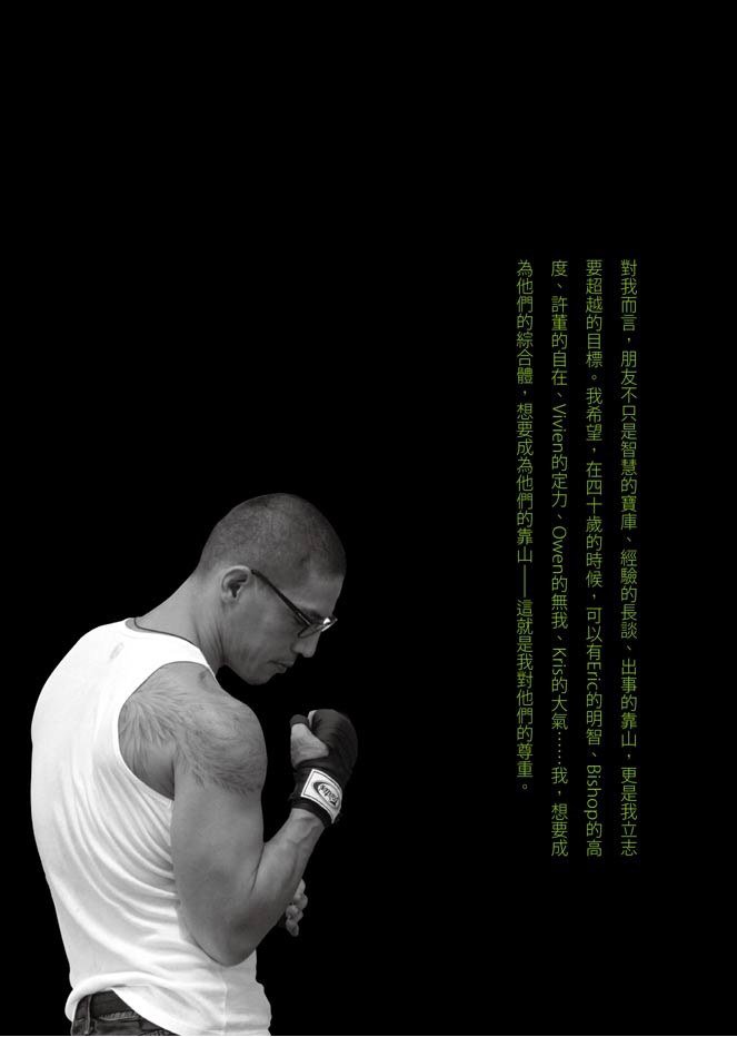 人的成長伴隨著各個時期的想法, 又經由個人的生長過程有所雕琢、改變,際遇的不同,塑造了獨特的個體,但我們不是就這樣被老天所定住,還是可藉由個人的內化及努力去改變, 為了將「自己」這個品牌,更加閃爍。 (大哥對蔣友柏的了解) 我認識蔣友柏X年,他並非外界所說的驕傲及叛逆,他勇敢做自己、時常流露出真性情, 雖有著強悍的外表,卻有著細膩無比的內心,是我多年的X好友。