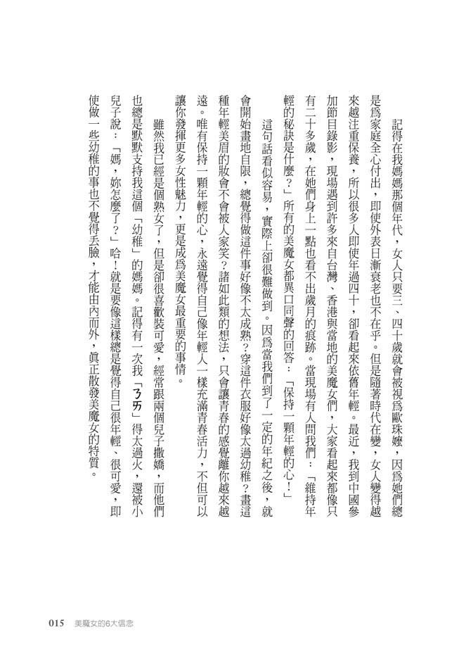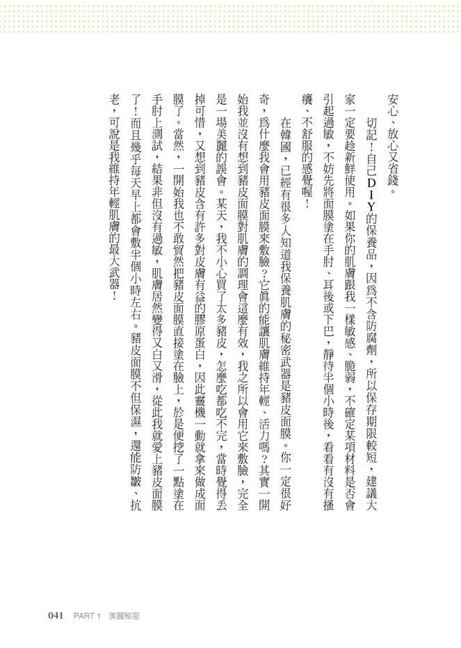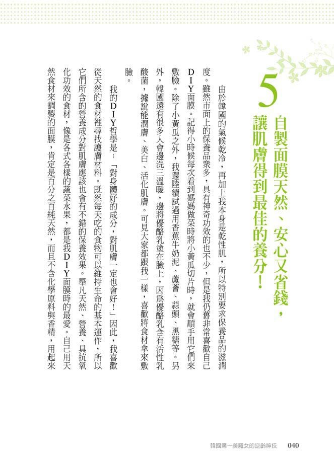 近來,台灣、日本、韓國都掀起一陣美魔女旋風,可見大家對於保養得宜、猜不出年紀的女性,都感到相當好奇。在我參加過韓國的「童顏選拔大賽」後,每次到電視台錄影時,大家都對我白皙無瑕的肌膚、纖細緊緻的身材感到好奇,尤其是二十二吋的小蠻腰,更令他們嘖嘖稱奇!許多人都問我到底是怎麼保養的?要怎麼才能做到「凍齡」,甚至是「逆齡」?需要花很多時間與金錢嗎?