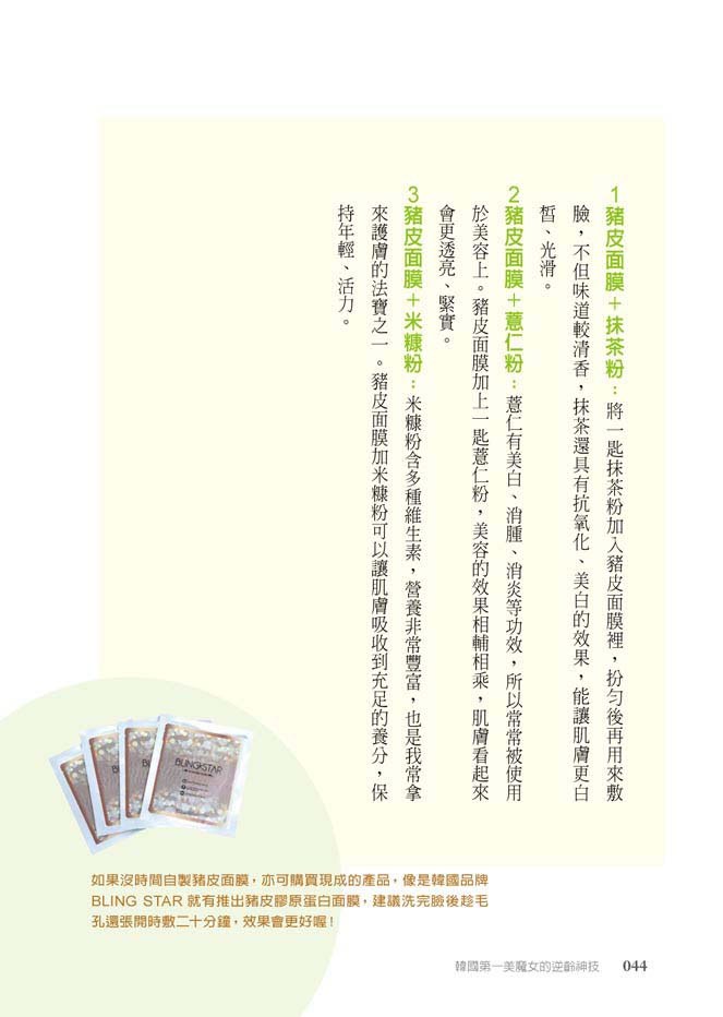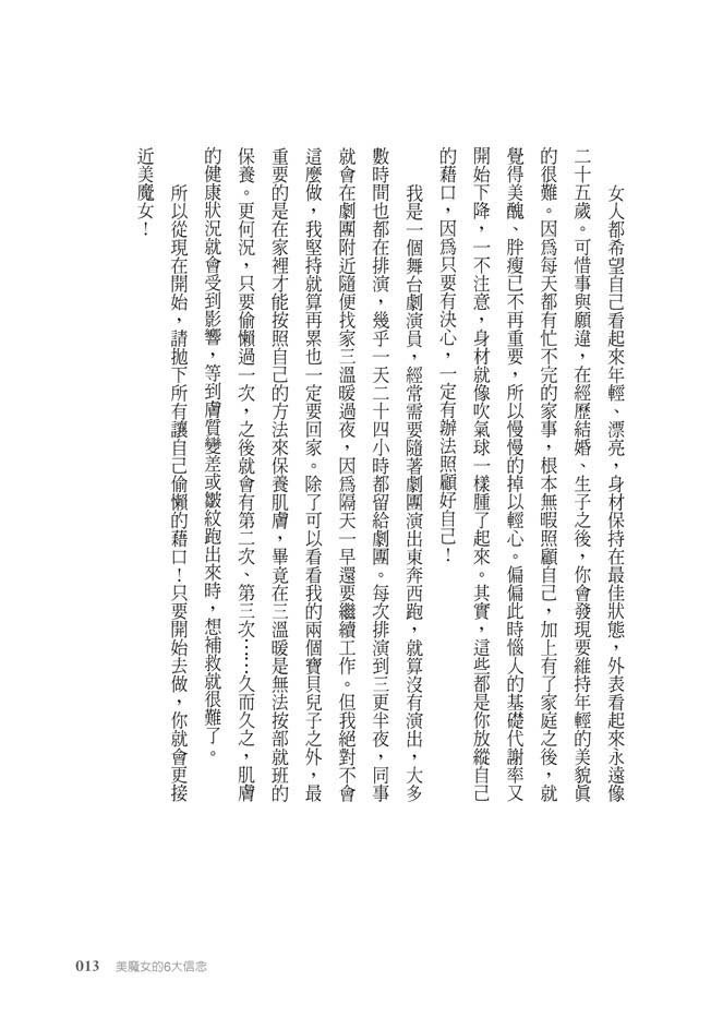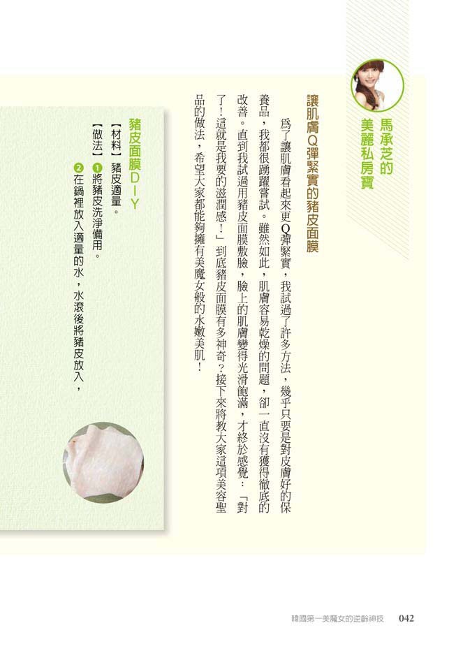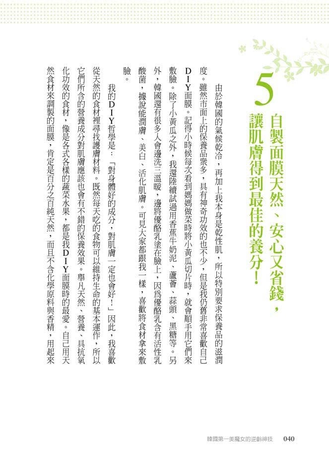 在韓國,很多人都說我是「美魔女」,也有人稱我為「童顏媽媽」。你可別以為成為這兩者的先決條件,就是擁有一張娃娃臉或吃不胖的身材。其實,再可愛的娃娃臉如果不勤加保養,也會因為歲月的摧殘而出現皺紋;再纖瘦的身材,終究會隨著年華老去而鬆垮變形。