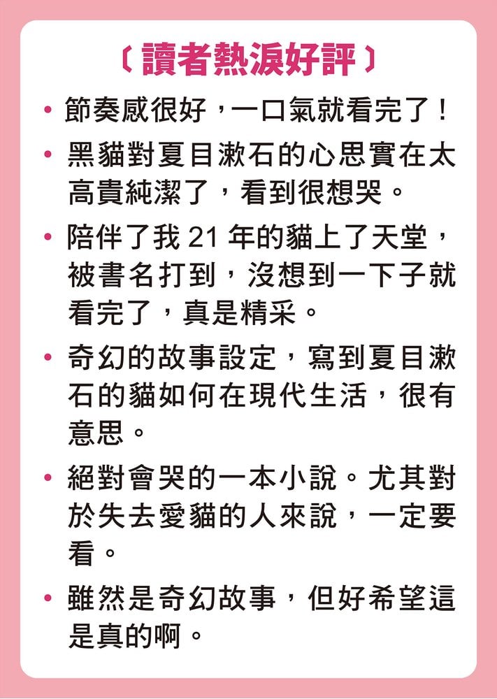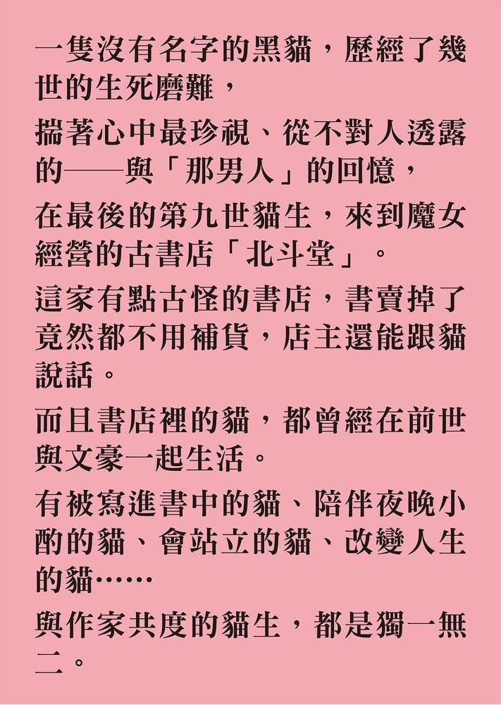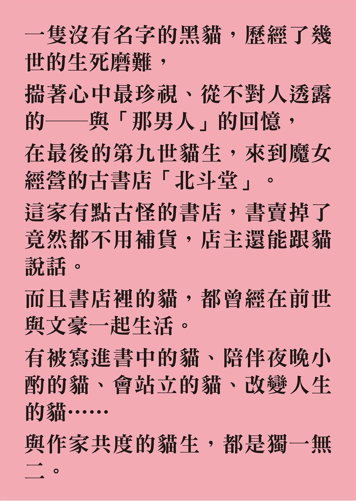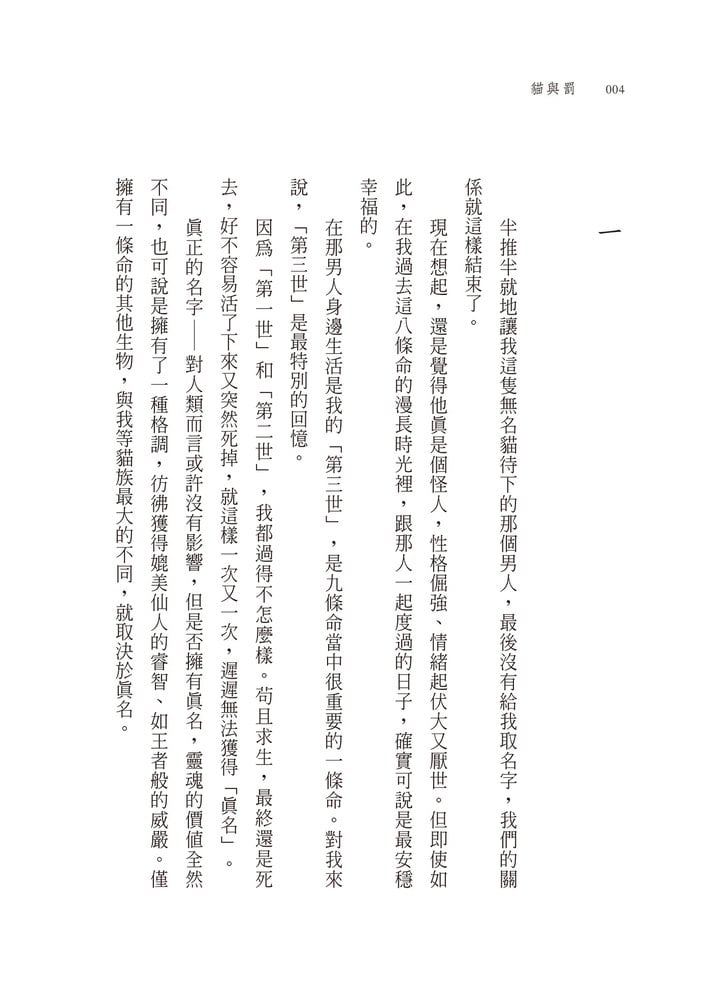 真正的名字──對人類而言或許沒有影響,但是否擁有真名,靈魂的價值全然不同,也可說是擁有了一種格調,彷彿獲得媲美仙人的睿智、如王者般的威嚴。僅擁有一條命的其他生物,與我等貓族最大的不同,就取決於真名。