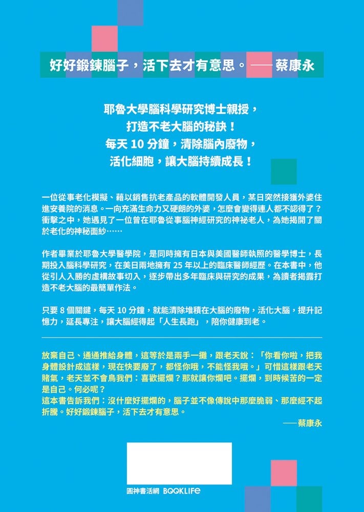 只要8個關鍵,每天10分鐘,就能清除堆積在大腦的廢物,活化大腦,提升記憶力,延長專注,讓大腦經得起「人生長跑」,陪你健康到老。