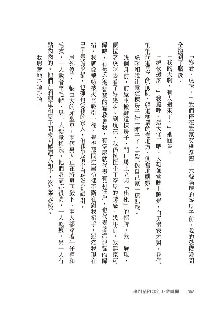 在首部作品《串門貓阿飛的奇蹟》裡,她不但找到了自己的寫作聲音,也把從小愛貓、養貓的熱情化做文字。能一次投入自己最熱愛的兩件事,令她無比幸福。
