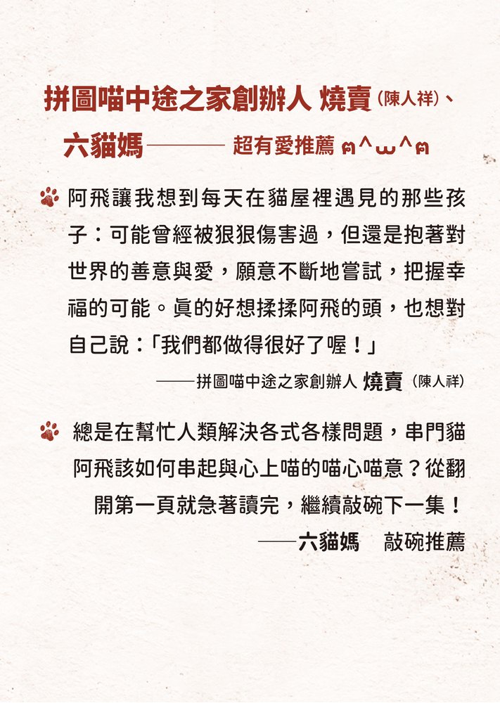 ♥ 阿飛貓是人類最好的朋友,阿飛貓可以分辨人心,阿飛貓是貓界的奇蹟,身懷拯救世界的本領——儘管劇情有些八點檔,但人類的生活在貓的眼中一定就是這麼奇特無解,人類就是這麼需要貓咪守護的可憐生物啊!每個人都需要一隻阿飛貓,只要有阿飛在,破破爛爛的人生就能被好好的修補起來!──六貓媽 期待續集、敲碗推薦