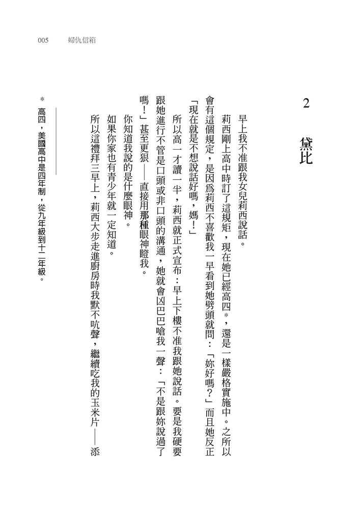 所以高一才讀一半,莉西就正式宣布:早上下樓不准我跟她說話。要是我硬要跟她進行不管是口頭或非口頭的溝通,她就會凶巴巴嗆我一聲:「不是跟妳說過了嗎!」甚至更狠──直接用那種眼神瞪我。