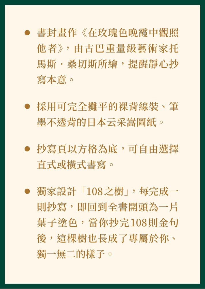 在12個手抄階段中,各有9則金句,合計108則。你可以依序抄寫,也能翻閱書頁,挑選當天最觸動內心的一句,靜心書寫。這本書的封面圖《在玫瑰色晚霞中觀照他者》,也是由當今古巴重量級且身價最高的藝術家托馬斯.桑切斯所繪。畫面中兩個人在周遭高大樹木包圍下,靜靜坐在湖邊對望,彷彿也在提醒靜心抄寫的本意──你落在紙上的每一筆,其實都是觀照,既是照見他者,也是照見自己。