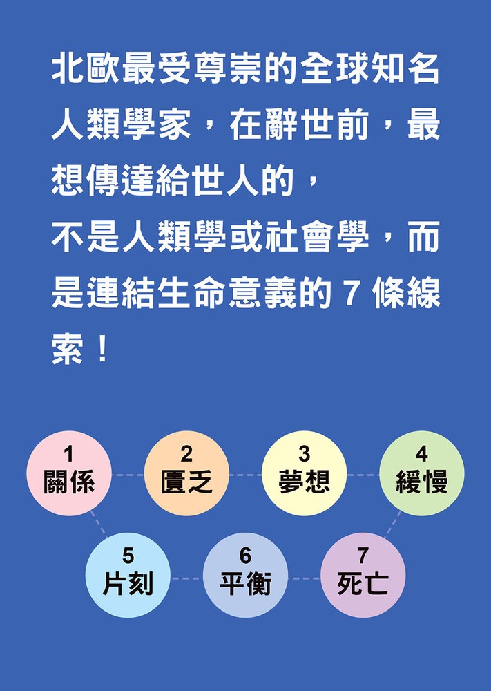 7個詞,有如7條線,串起了人與人的關係,交織出一位學者獻給全人類的最後禮物──帶你找到讓這一生活得有意義、有價值的珍貴連結。