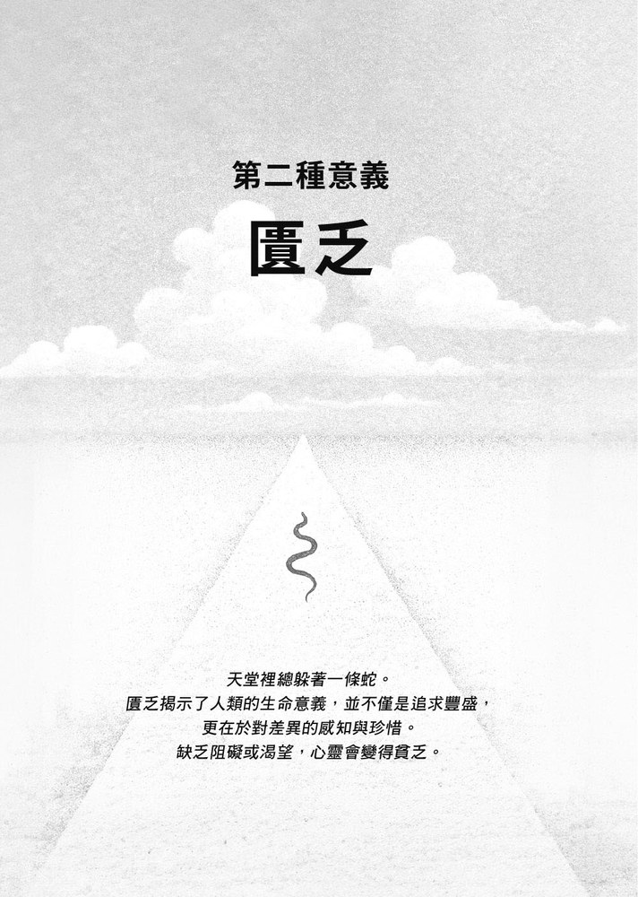 天堂裡總躲著一條蛇。匱乏揭示了人類的生命意義,並不僅是追求豐盛,更在於對差異的感知與珍惜。缺乏阻礙或渴望,心靈會變得貧乏。