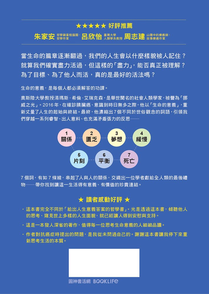 奧斯陸大學教授湯瑪斯.希倫.艾瑞克森,是舉世聞名的社會人類學家,被譽為「挪威之光」。2016年,在確診胰臟癌、意識到時日無多之際,他以「生命的意義」,重新丈量了人生的起始與終結。最終,他濃縮出7個不同於世俗觀念的詞語,引領我們穿越一系列睿智、出人意料、也充滿矛盾張力的反思──