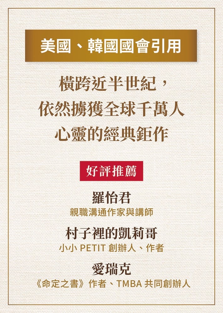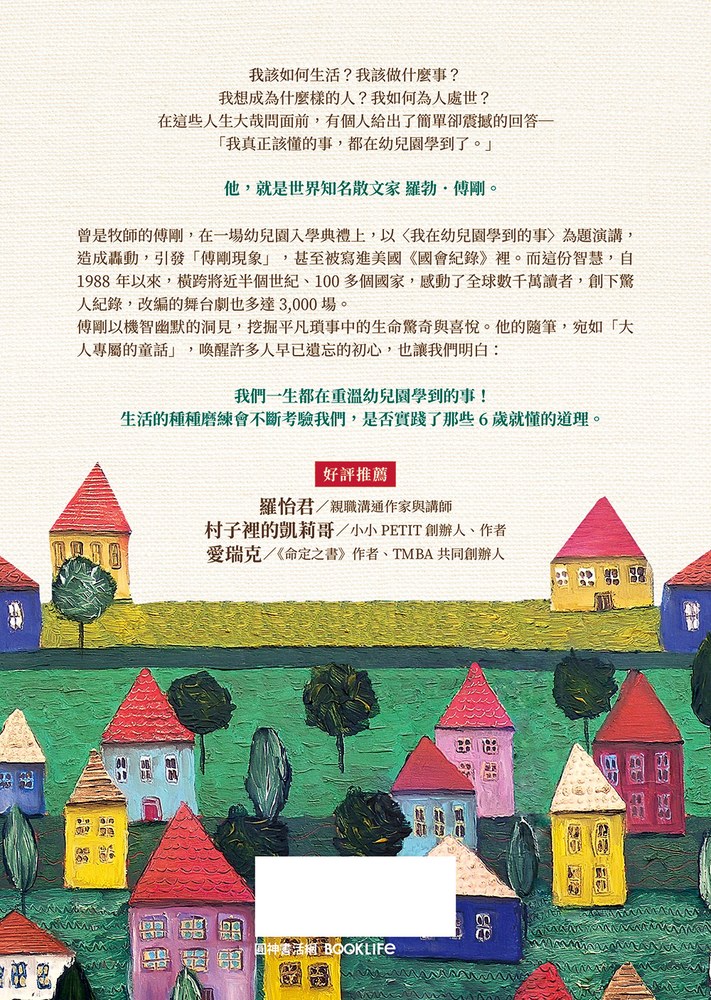 曾是牧師的傅剛,在一場幼兒園入學典禮上,以〈我在幼兒園學到的事〉為題演講,造成轟動,引發「傅剛現象」,甚至被寫進美國《國會紀錄》裡。而這份智慧,自 1988 年以來,橫跨將近半個世紀、100多個國家,感動了全球數千萬讀者,創下驚人紀錄,改編的舞台劇也多達3,000場。