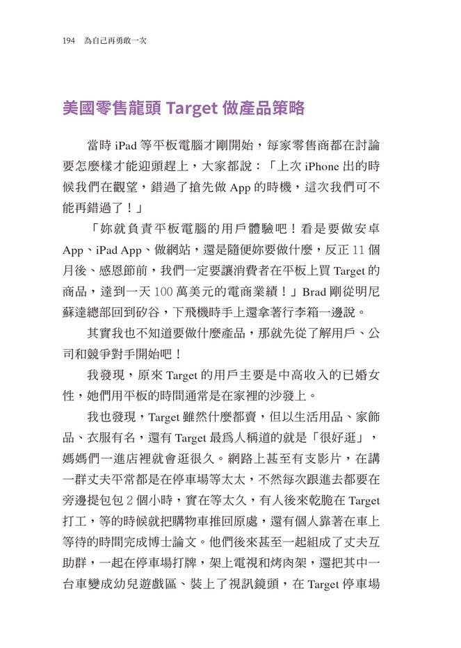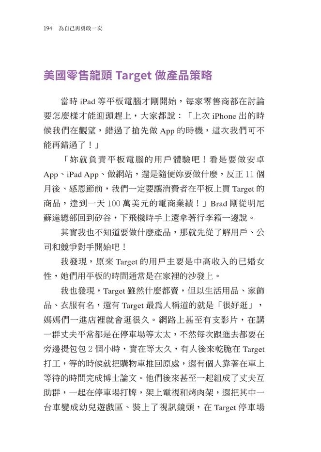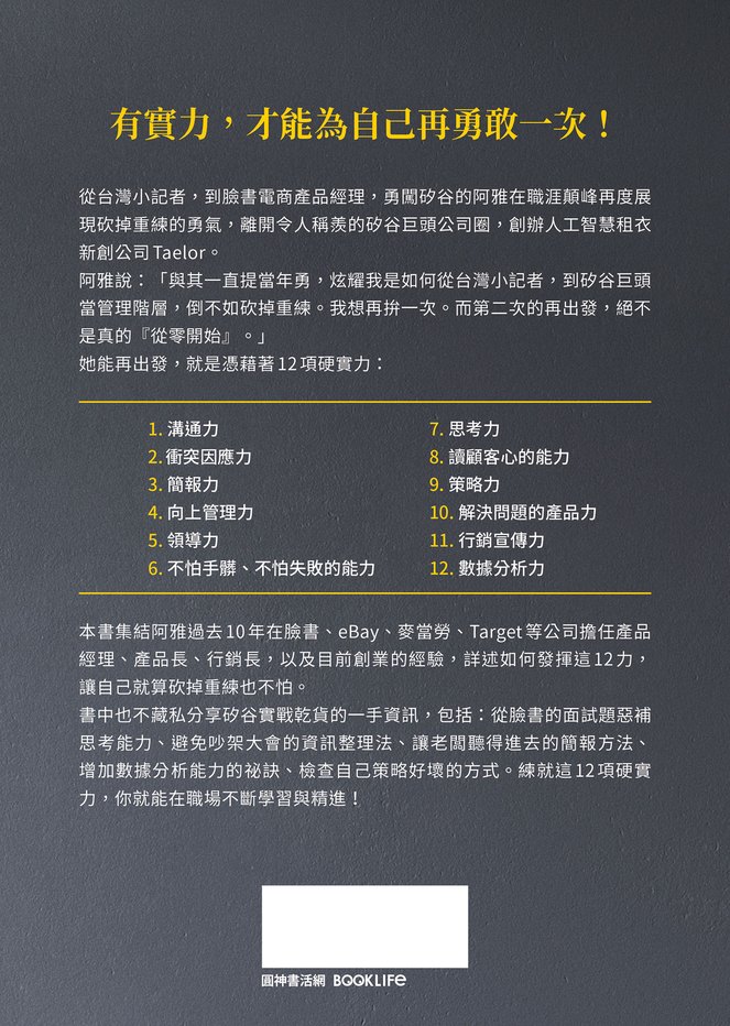 本書集結阿雅過去10年在臉書、eBay、麥當勞、Target等公司擔任產品經理、產品長、行銷長,以及目前創業的經驗,詳述如何發揮這12力,讓自己就算砍掉重練也不怕。