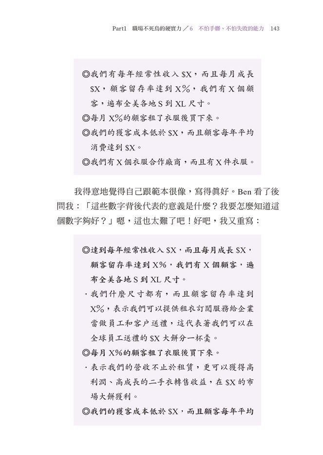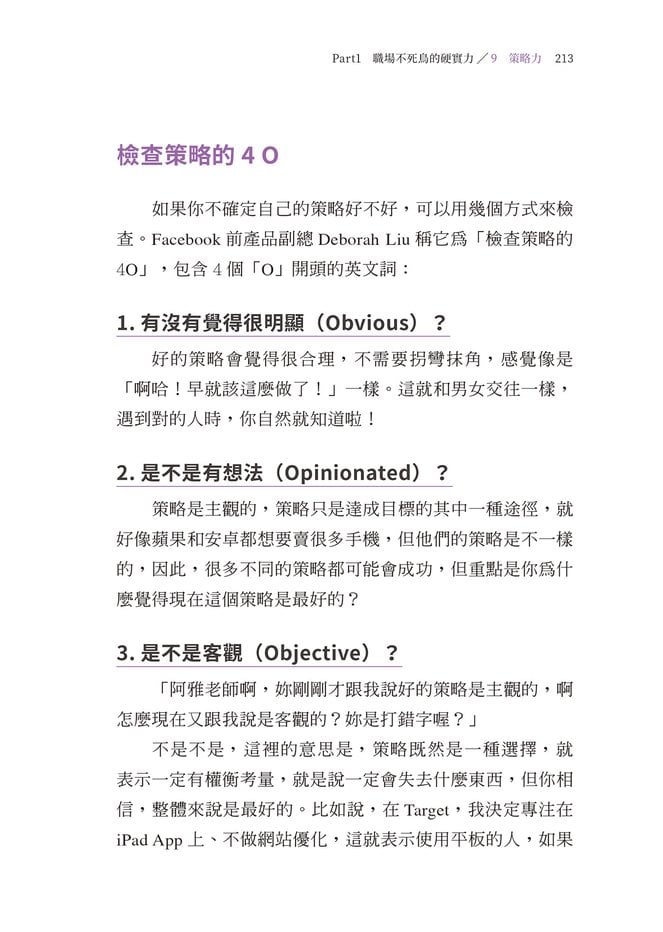 書中也不藏私分享矽谷實戰乾貨的一手資訊,包括:從臉書的面試題惡補思考能力、避免吵架大會的資訊整理法、讓老闆聽得進去的簡報方法、增加數據分析能力的祕訣、檢查自己策略好壞的方式。練就這12項硬實力,你就能在職場不斷學習與精進!