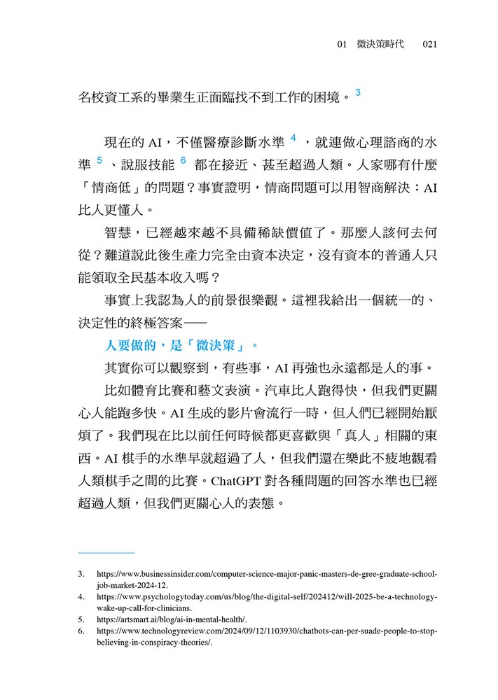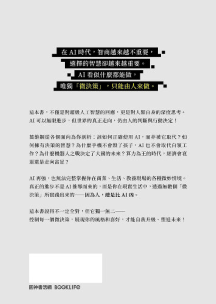 在這個意義上,決策不但是你的權力,也是你的權利:你將透過這個決策展現你的個性、你的風格、你的價值觀、你的衝動。你的每一個決策塑造了你,你透過每一個決策塑造世界。而AI,它的決策只不過是展現了一種數學可能性而已。