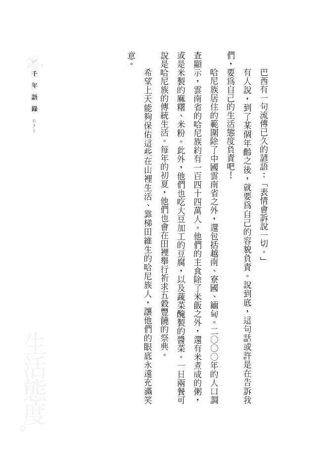 長久以來,有許多人將這些格言流傳下去。他們所注入的真誠與祈願,也成為延長格言生命的土壤。有些格言目前雖然還是種子,但我深信終有一天將長成一排又一排的樹苗,滋潤眾人的心靈與未來。有些國家與地區的格言很難嚴格地判斷是否流傳「千年」,因此本書所節的都是當地「自古以來長久流傳下來的格言」。