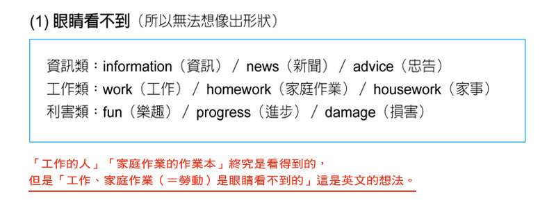 2完全解答學生時代的疑問:諸如「為什麼bread是不可數名詞?」「為什麼中文的『在』英文有at、in、on…等說法」……學生時代不懂的種種疑問,都將獲得解答。