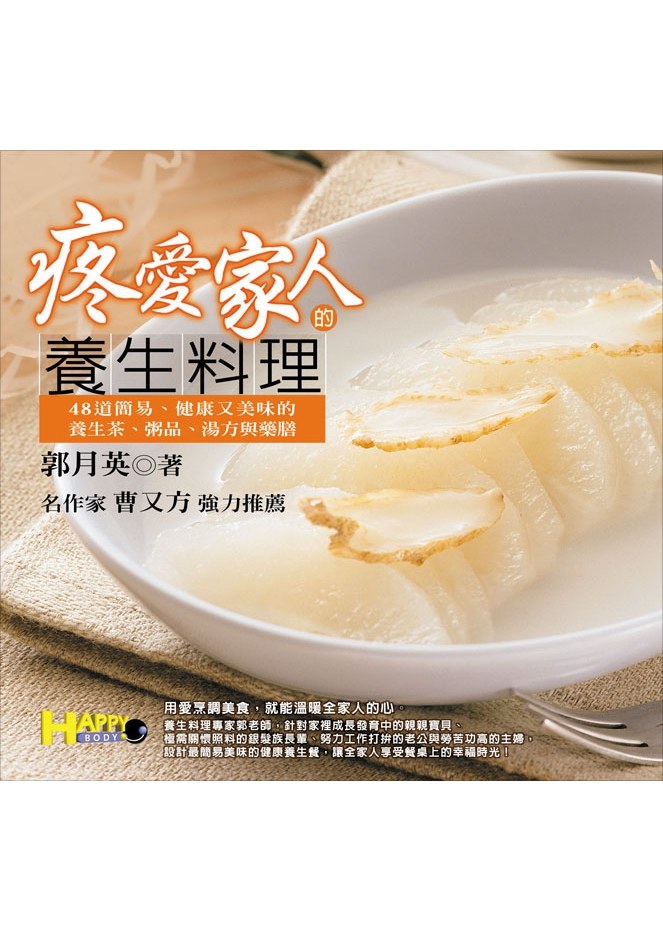 48道簡易健康又美味的養生茶、粥品、湯方與藥膳。養生料理專家郭老師,針對家裡成長發育中的親親寶貝、極需關懷照料的銀髮族長輩、努力工作打拚的老公與勞苦功高的主婦,設計最簡易美味的健康養生餐,讓全家人享受餐桌上的幸福時光!
