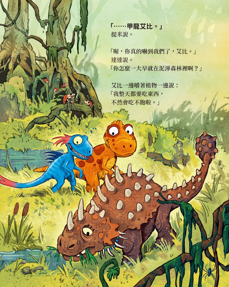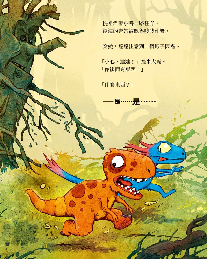 森林有點可怕,有大片沼澤地,到處都是蕨類、雜草和灌木叢,但他們還是鼓起勇氣前進,一路上遇到甲龍、飛天恐龍、小盜龍……沒想到,最最可怕的竟然是……。