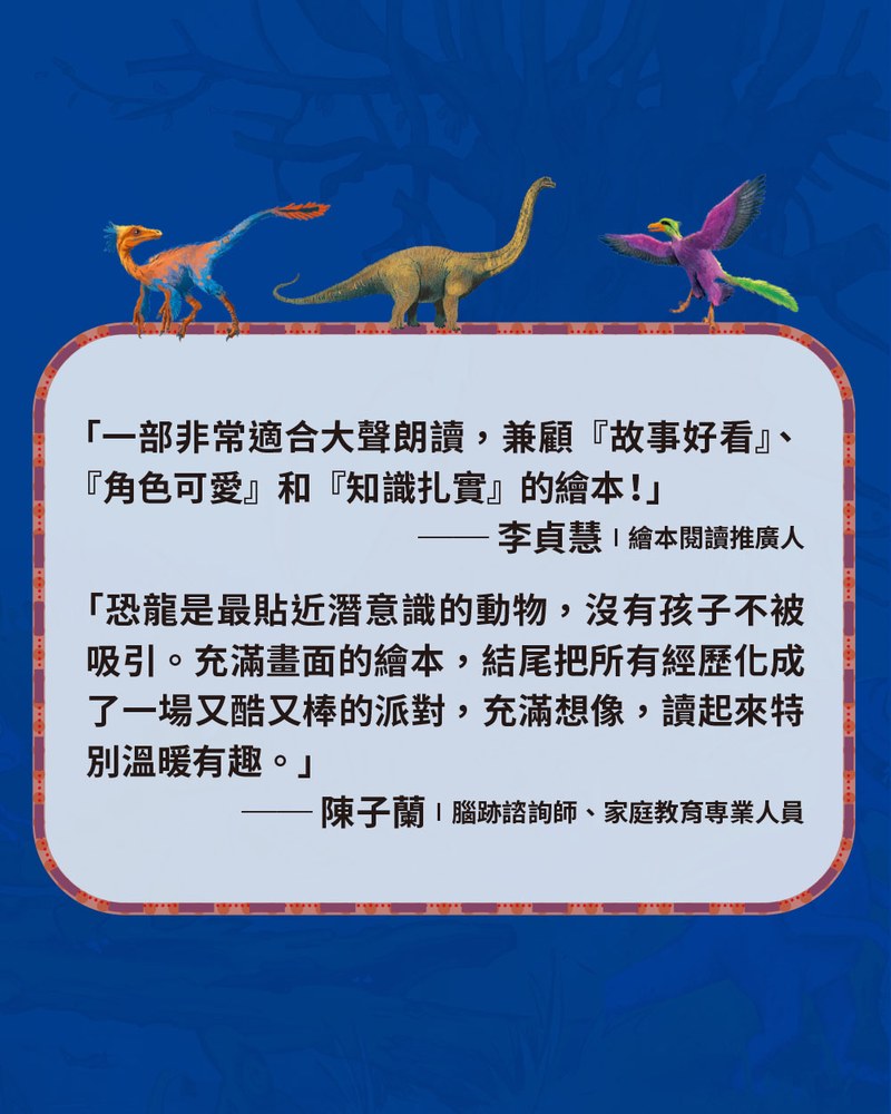 「恐龍是最貼近潛意識的動物,沒有孩子不被吸引。充滿畫面的繪本,結尾把所有經歷化成了一場又酷又棒的派對,充滿想像,讀起來特別溫暖有趣。」──陳子蘭 腦跡諮詢師、家庭教育専業人員
