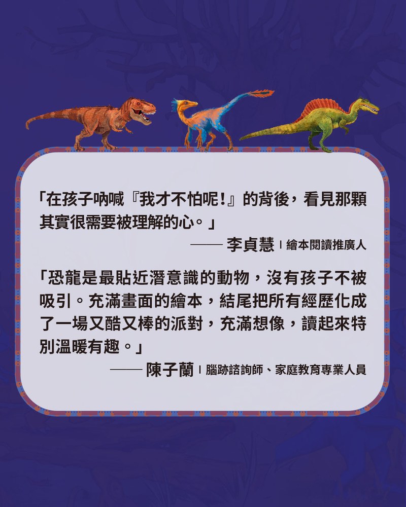 「恐龍是最貼近潛意識的動物,沒有孩子不被吸引。充滿畫面的繪本,結尾把所有經歷化成了一場又酷又棒的派對,充滿想像,讀起來特別溫暖有趣。」──陳子蘭 腦跡諮詢師、家庭教育専業人員