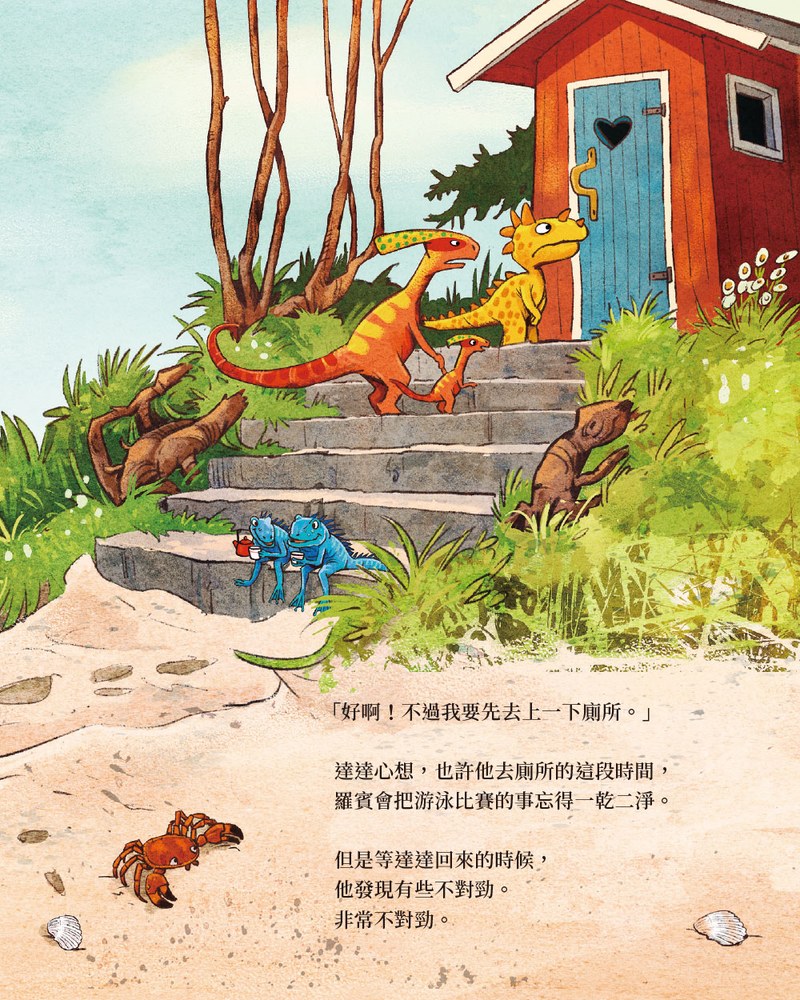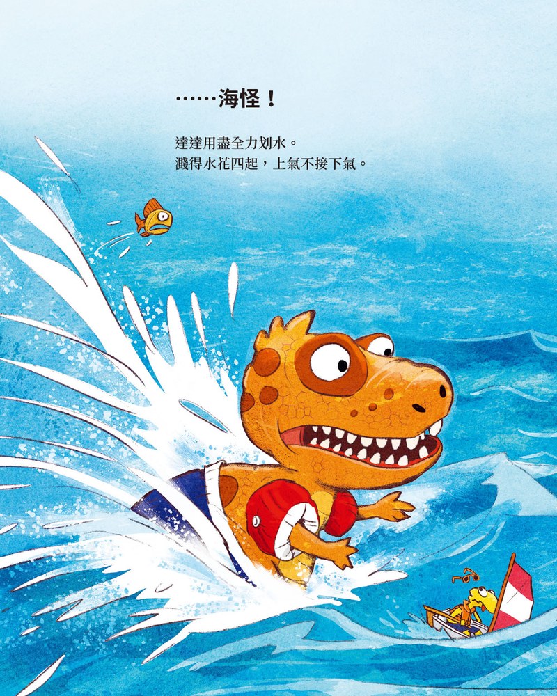 達達一家人和提米一起去海邊玩,當哥哥羅賓提出比賽游泳時,還不太會游泳的達達勉強答應了,但又有點害怕。媽媽要他們別游太遠,因為聽說有海怪出沒。