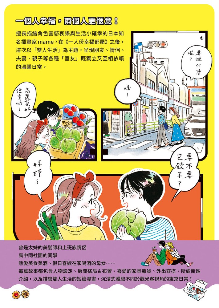 擅長描繪角色喜怒哀樂與生活小確幸的日本知名插畫家mame,在《一人份幸福部屋》之後,這次以「雙人生活」為主題,呈現朋友、情侶、夫妻、親子等各種「室友」既獨立又互相依賴的溫馨日常。