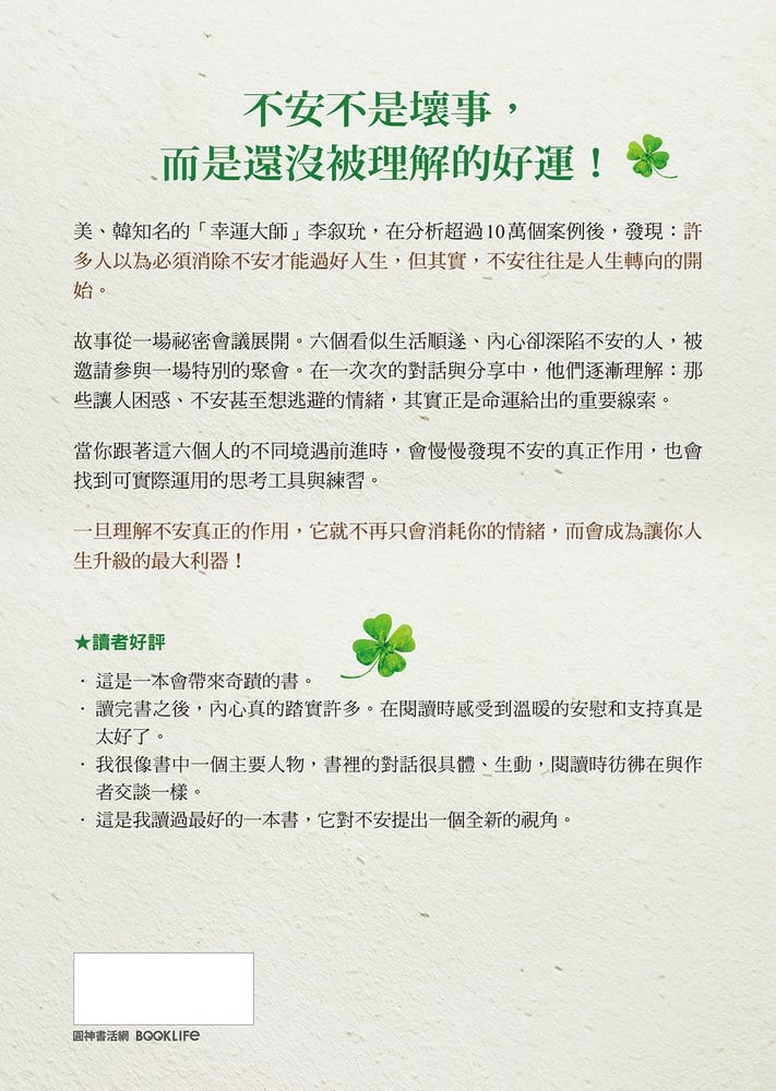 美、韓知名的「幸運大師」李叙玧,在分析超過10萬個案例後,發現:許多人以為必須消除焦慮才能過好人生,但其實,焦慮往往是人生轉向的開始。