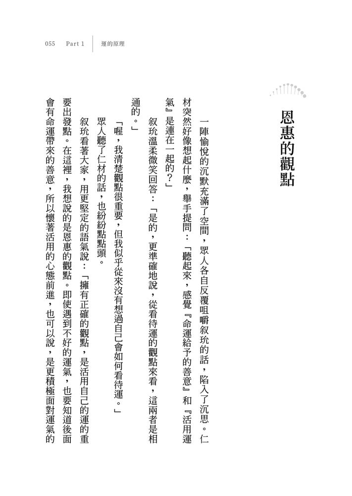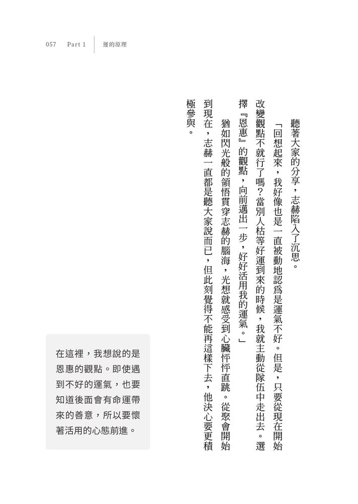 書中一再強調,重塑命運的力量就在我們體內;一個人若能改變看待處境的角度,命運的流向也會跟著改變。
