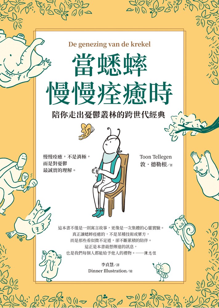 甫翻開《當蟋蟀慢慢痊癒時》的扉頁,我天真地以為這會是輕鬆溫馨的童話故事。然而,隨著情節鋪陳推展,字裡行間漸漸瀰漫著沉重與愁悶的氛圍。本是森林中最愛唱歌、最自在的小蟋蟀,卻在某一天,腦袋忽然壓進無法卸下的巨石,他嘹亮的歌聲變得遙不可及,快樂的笑顏成了昨日的記憶。長久盤旋在他心中卻難以啟齒的疑問:「當心突然變得好沉重、好沉重時,我該怎麼辦?」