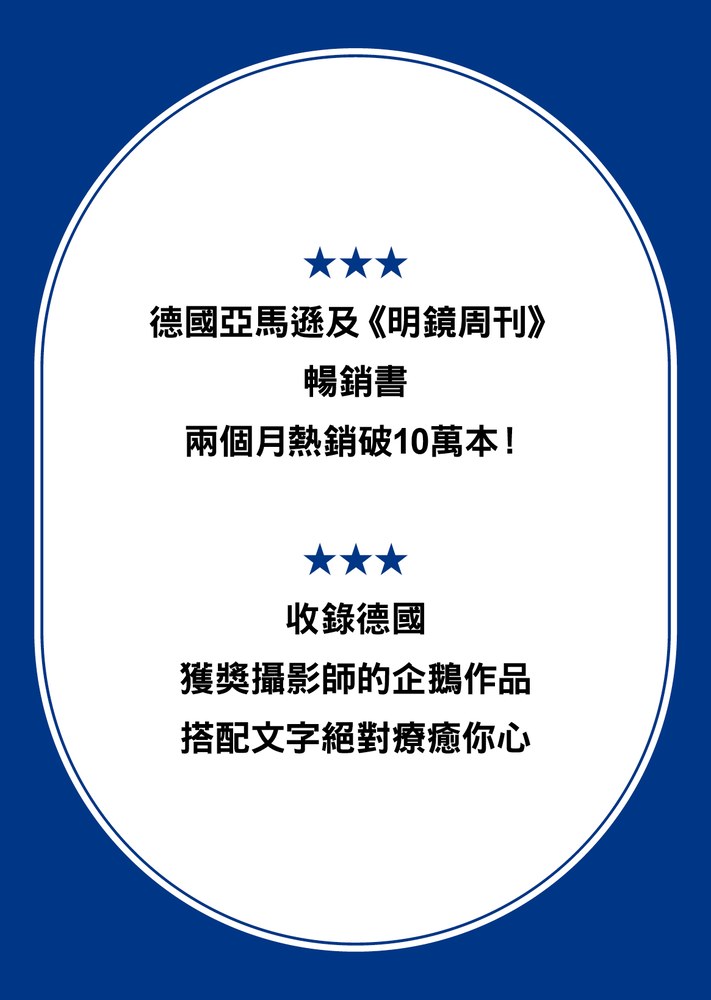 德國亞馬遜及《明鏡周刊》暢銷書,兩個月熱銷破10萬本!收錄德國獲獎攝影師的企鵝作品,搭配文字,絕對療癒你心。本書作者原本是個醫生,在醫院服務期間,他逐漸明白一件事:他不善於處理例行公事,比較擅長自由表達、迸發新點子,於是,他決定轉向到能夠發揮自身特質的領域,成為結合幽默和醫學知識的脫口秀演員。帶動他轉念的,是一群企鵝。當時他對企鵝充滿誤解:肚子肥、不會飛,走路蹣跚,還沒長膝蓋。沒想到一轉眼企鵝躍入水中,快如飛梭地游動,甚至還似乎向他投來了一抹「你可別小看我」的白眼……他猛然領悟:企鵝只要離開「不適合的環境」,便能怡然自得、餵飽自己。我們每個人也是一樣,只要在恰當的環境中,我們的潛質自然會有機會展現。