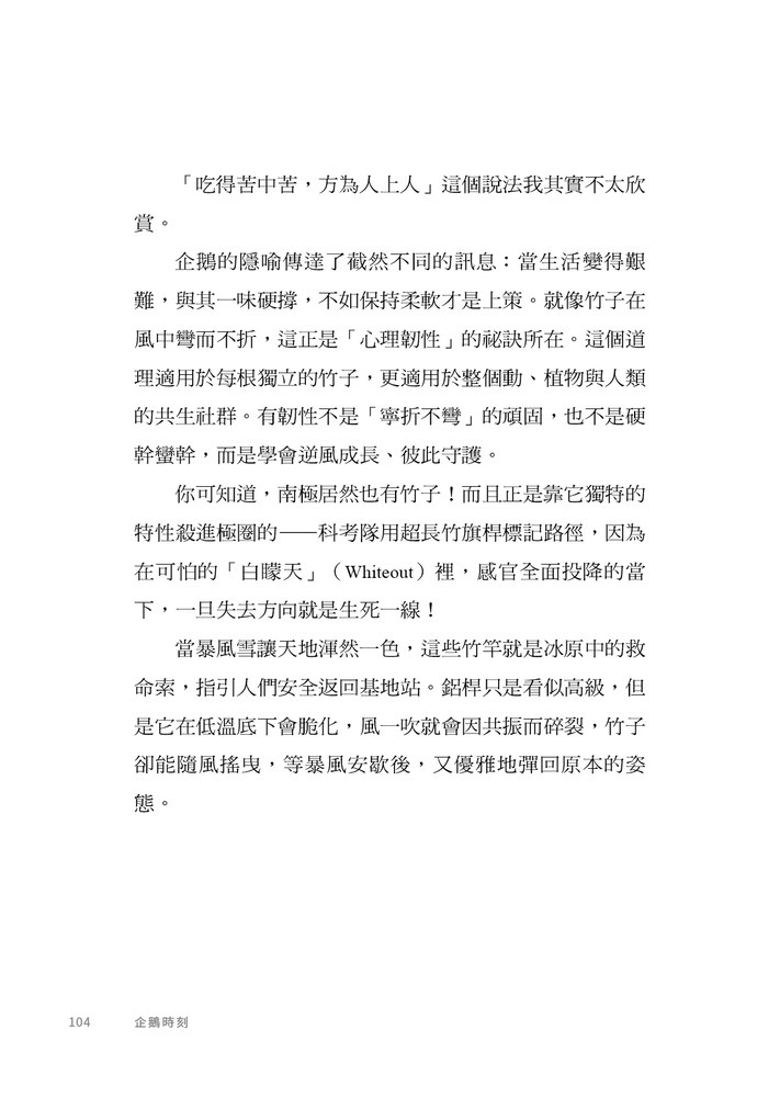 帶動他轉念的,是一群企鵝。當時他對企鵝充滿誤解:肚子肥、不會飛,走路蹣跚,還沒長膝蓋。沒想到一轉眼企鵝躍入水中,快如飛梭地游動,甚至還似乎向他投來了一抹「你可別小看我」的白眼……他猛然領悟:企鵝只要離開「不適合的環境」,便能怡然自得、餵飽自己。我們每個人也是一樣,只要在恰當的環境中,我們的潛質自然會有機會展現。