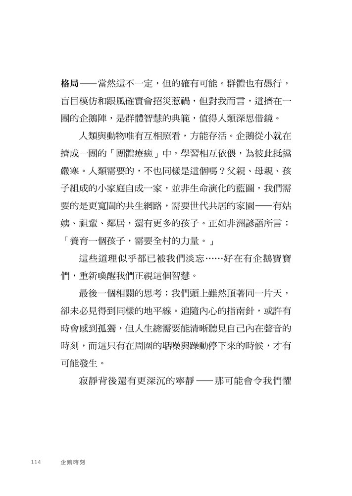 所以,我想為你呈現的是企鵝為我們準備的功課,以及那些從牠們非比尋常的生命中,值得借鑑的事。因此,我願向你敞開我的內心,讓當中的畫面沁透你,也請你留意自己的內心浮現了什麼畫面。也許我奔放的思緒與聯想能在這裡幫助到你。請如常地翻閱、瀏覽、擷取當下覺得最能夠滋養「此刻的你」的精華吧。