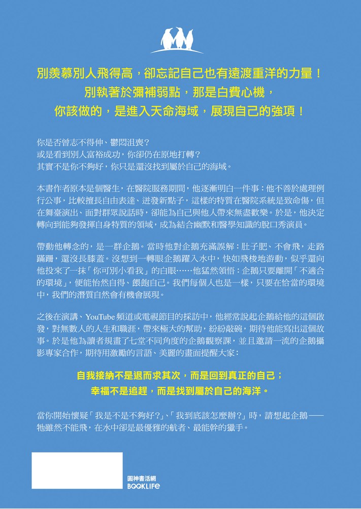 當你開始懷疑「我是不是不夠好?」、「我到底該怎麼辦?」時,請想起企鵝——牠雖然不能飛,在水中卻是最優雅的航者、最能幹的獵手。
