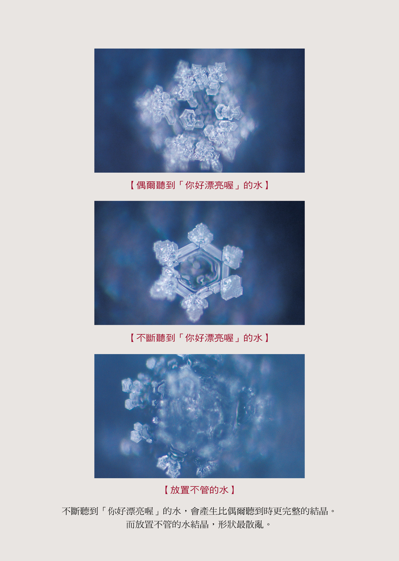 透過水結晶呈現的樣態,我們可以清楚的看到讚美跟責備的語言,如何影響我們的情緒波動──因為,人就是水。