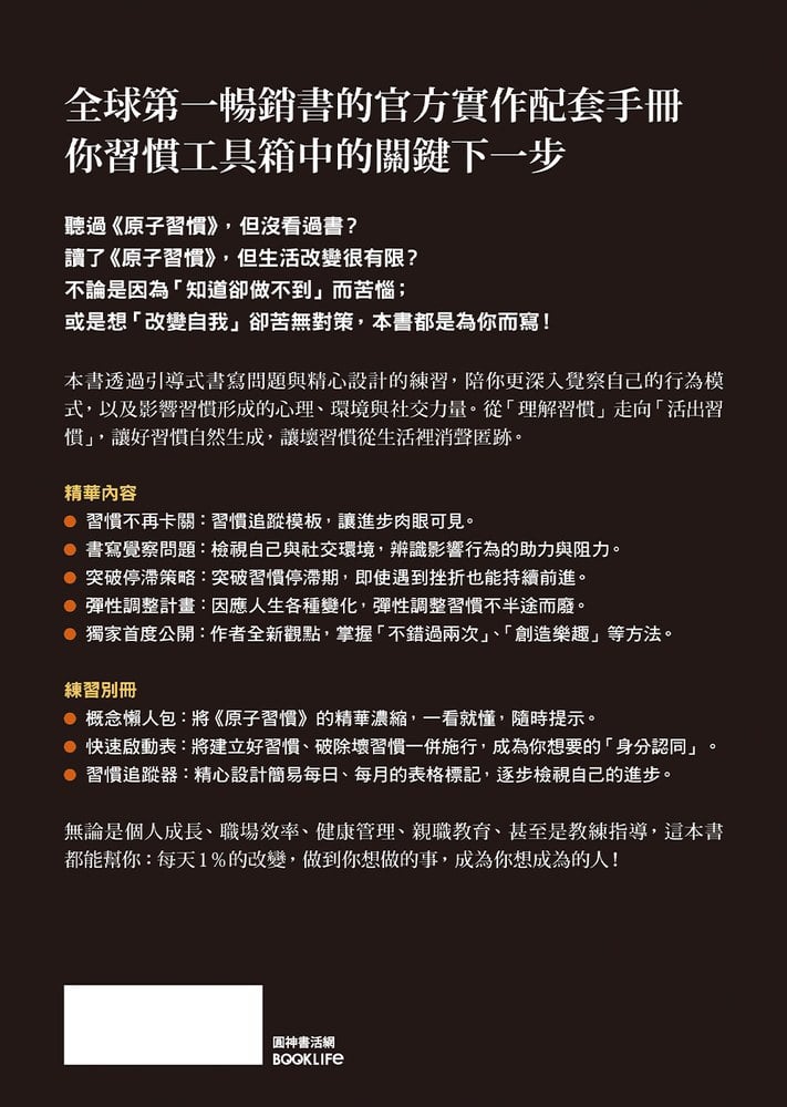 這本WORKBOOK正是由此而生。它把《原子習慣》的理念與練習拆解為可執行的簡單步驟,任何人都能上手。你不必再苦思如何將「行為改變四法則」套用到習慣上,而是透過練習自然而然落實。